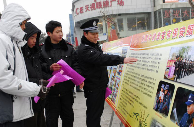 元月10日,是公安機(jī)關(guān)110宣傳日。當(dāng)日,總公司辦公室組織保安管理部、駐外保安部、押運(yùn)中心、培訓(xùn)部、技術(shù)防范部等部門(mén),與公安機(jī)關(guān)一起在古順河體育館門(mén)前開(kāi)展《保安服務(wù)管理?xiàng)l例》宣傳活動(dòng),通過(guò)拉橫幅、放展板、散資料等方式,廣泛宣傳保安條例,接受市民咨詢,深層次了解群眾對(duì)保安工作的需求和意見(jiàn)。