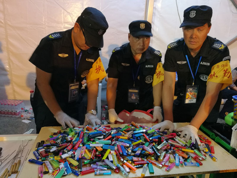 在此次是兩天的晚會(huì)安保工作中,保安員共查獲各類假證50余張,違禁品15000余件,其中包括打火機(jī)5000余只,各類液體、飲料、化妝品等9000余瓶,管制刀具、剪刀等18把。確保了音樂節(jié)活動(dòng)順利、有序、安全。
